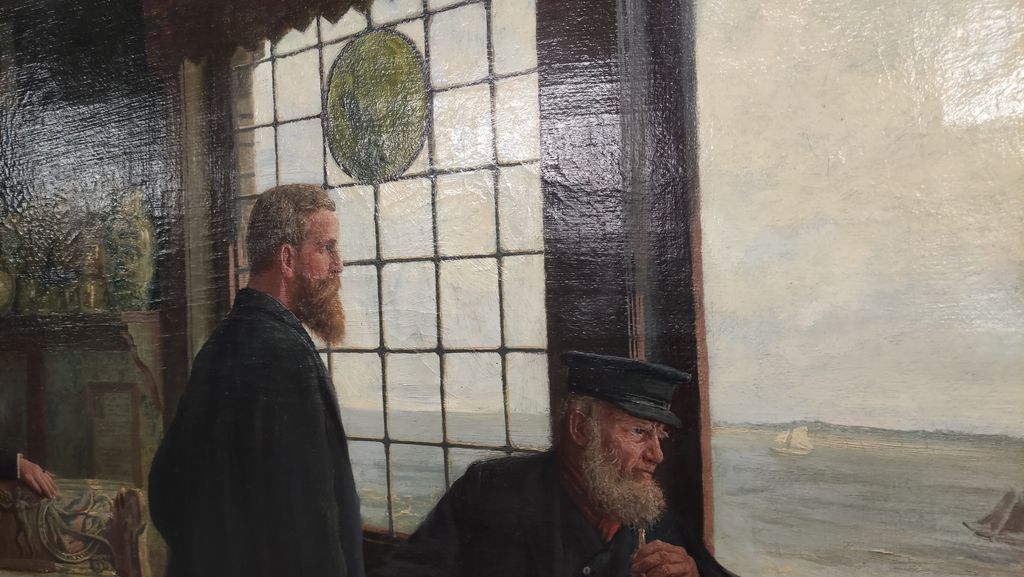 Nun informiert ein kleines Schild, dass dieser Schrank mit ähnlichen anderen aus dem Herrenzimmer des Bankvorstehers Jürgen Harmsen stammt. Ein Schaustück einer gehobenen bürgerlichen Familie.